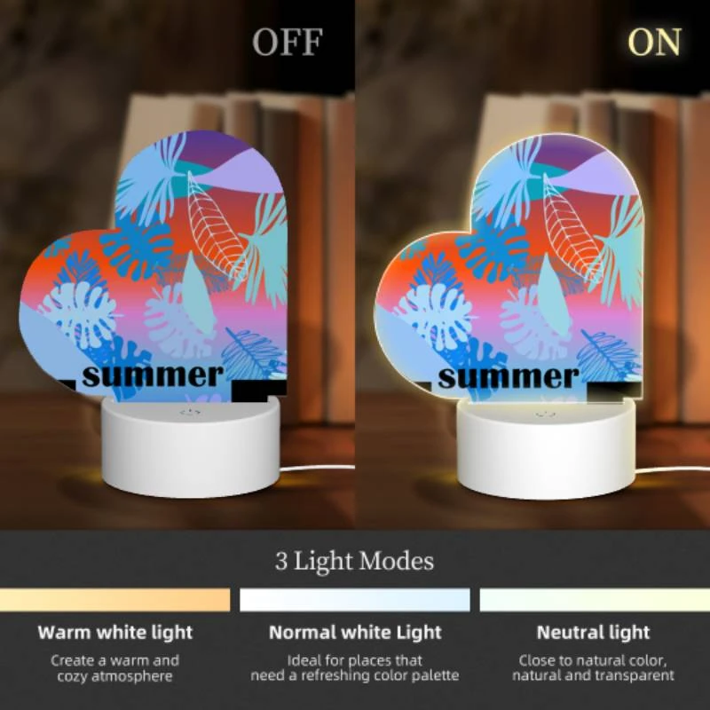 [Product Performance] The night light is composed of an acrylic light board and a plastic base. The night light has 3 light options (white light, warm light, warm white light). Touch to switch the light mode, which is soft and not dazzling, harmless to the eyes, and accompanies you into sweet dreams every night, creating a comfortable sleeping environment.