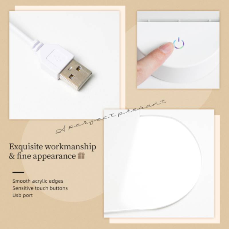 [Product Performance] The night light is composed of an acrylic light board and a plastic base. The night light has 3 light options (white light, warm light, warm white light). Touch to switch the light mode, which is soft and not dazzling, harmless to the eyes, and accompanies you into sweet dreams every night, creating a comfortable sleeping environment.