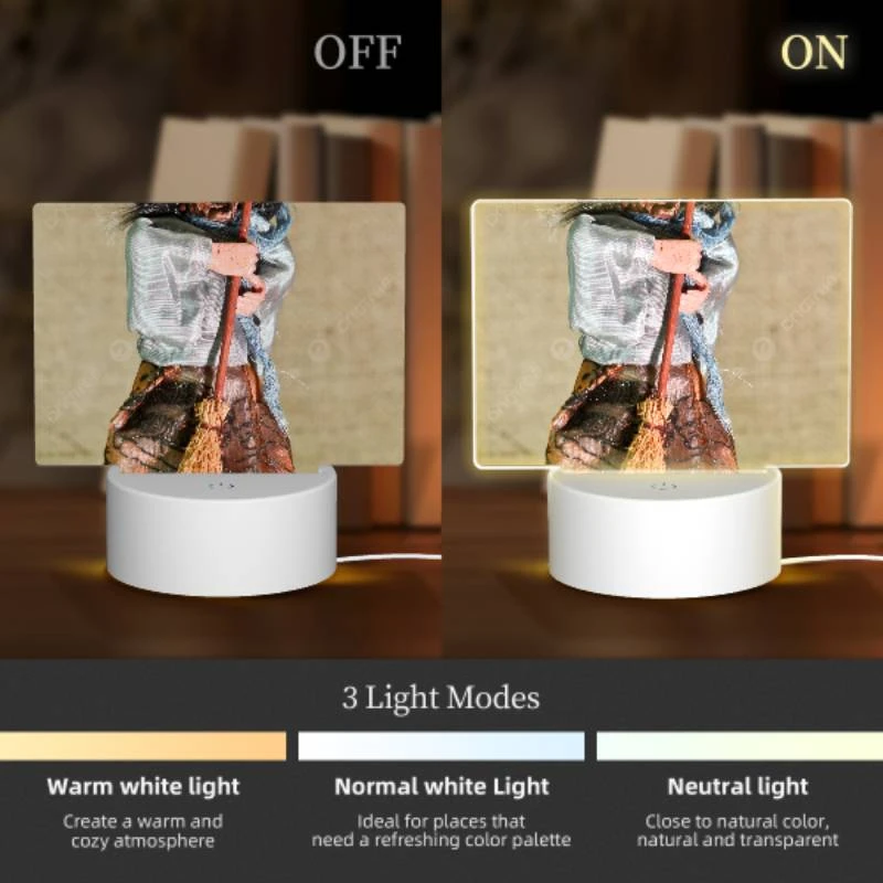 [Product Performance] The night light is composed of an acrylic light board and a plastic base. The night light has 3 light options (white light, warm light, warm white light). Touch to switch the light mode, which is soft and not dazzling, harmless to the eyes, and accompanies you into sweet dreams every night, creating a comfortable sleeping environment.