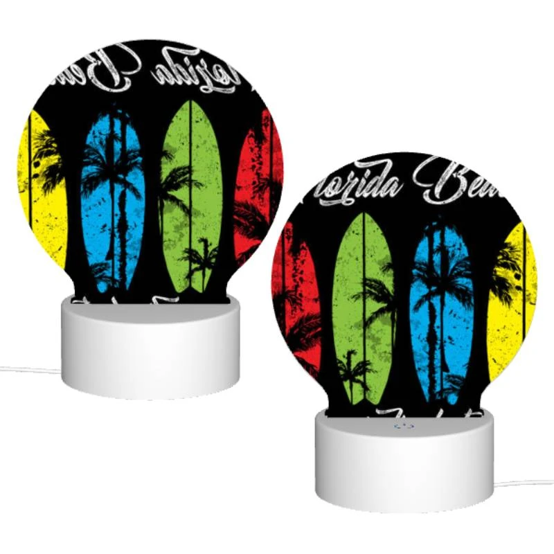 Be the first to review “Round Acrylic Night Light, A Black And White Image Of A Surfboard With The Words Florida Beach Paradise Lost Written On It.” Cancel reply