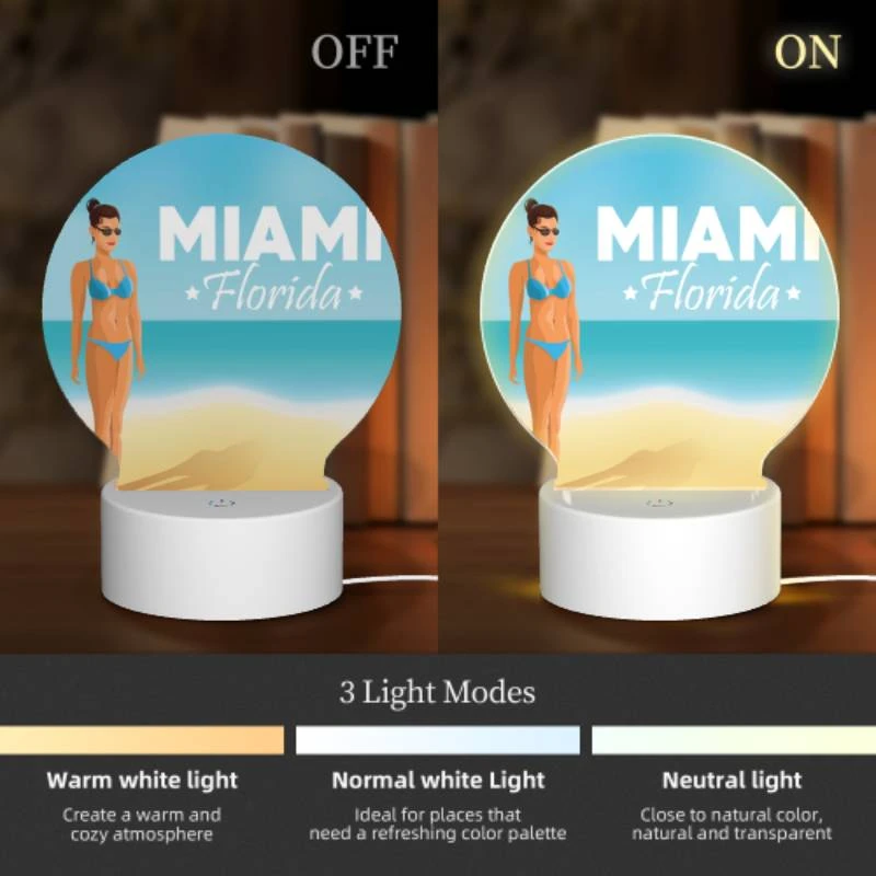 Be the first to review “Round Acrylic Night Light, A Woman In A Bikini Stands On A Beach In Front Of A Sign That Reads “Miami Florida.”” Cancel reply