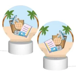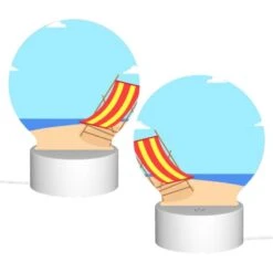 Round Acrylic Night Light, A Collection Of Six Postage Stamps Featuring Beach And Ocean Themes.