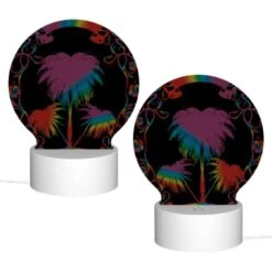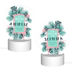 Round Acrylic Night Light, A Colorful Poster That Says “Say Hello To Summer” With A Palm Tree On It.